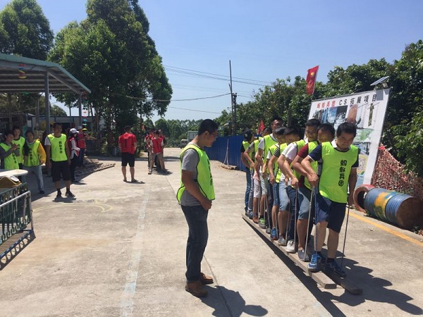團(tuán)隊在當(dāng)天上午9點半左右到達(dá)目的地,經(jīng)過短暫的休息后,進(jìn)行了分組團(tuán)隊建設(shè)及熱身小活動。緊接著,作為活動的第一個項目無軌列車隆重登場了,本項目要求團(tuán)隊成員雙腳分別站在兩塊長約5~8米,安裝有10個提繩的長條木板上并手握提繩,行走一定的距離。由于剛開始大家沒有找到項目的技巧,舉步難行,兩隊都是東倒西歪,經(jīng)過磨合溝通后,最終順利地完成了比賽。該項目提升了團(tuán)隊激情及凝聚力。